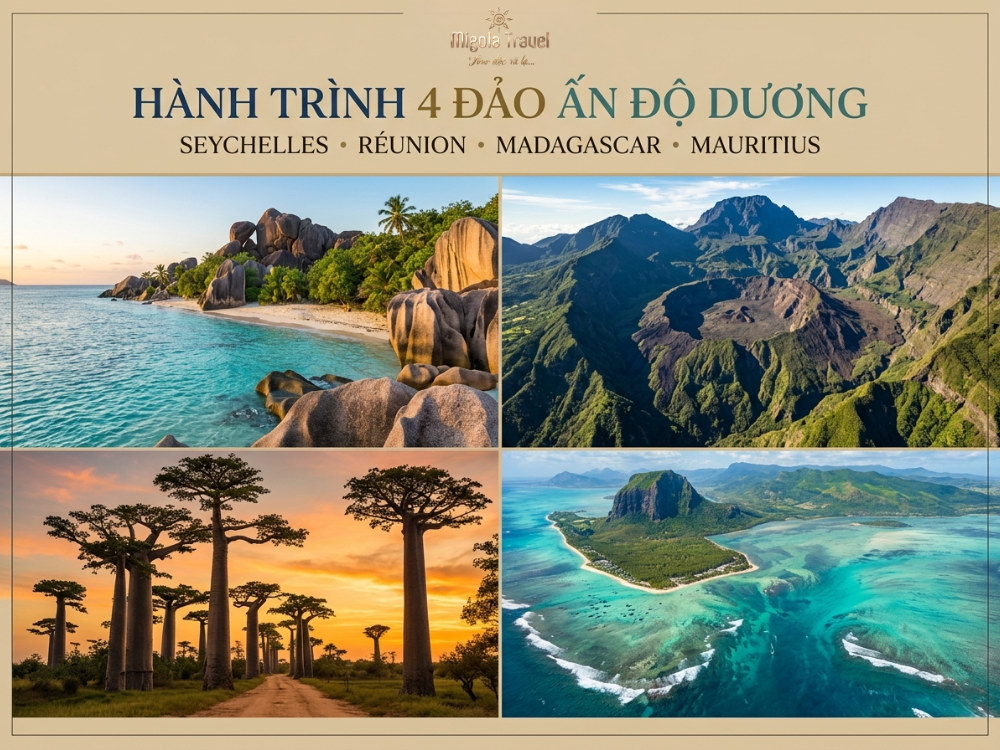 Một trong những hành trình đặc biệt nhất của Migola Travel, đưa du khách đi qua bốn hòn đảo giữa Ấn Độ Dương với bốn hệ sinh thái hoàn toàn khác nhau: Seychelles với đá granit và biển xanh, Réunion với đảo núi lửa, Madagascar với cây bao báp và hệ động thực vật đặc hữu, Mauritius với rạn san hô và bãi biển nhiệt đới.