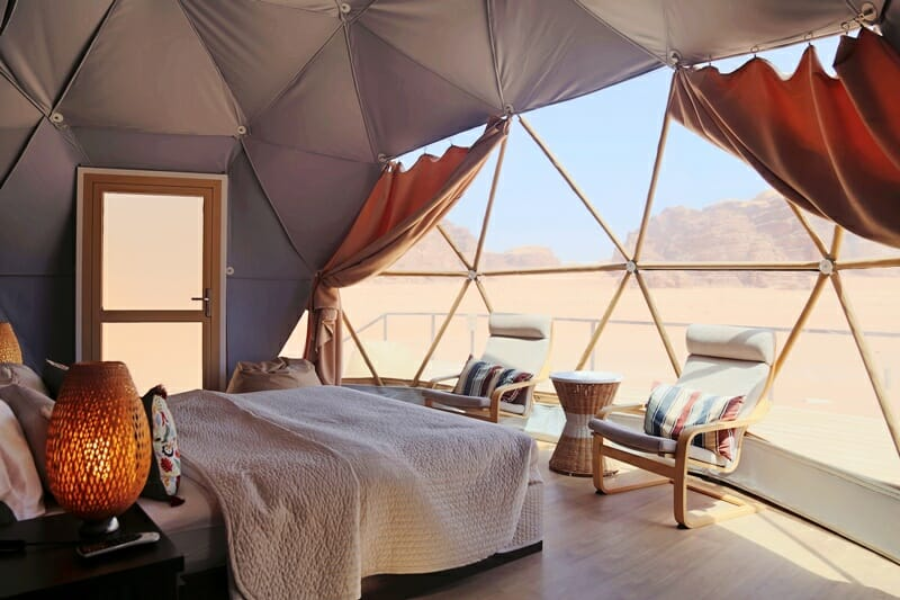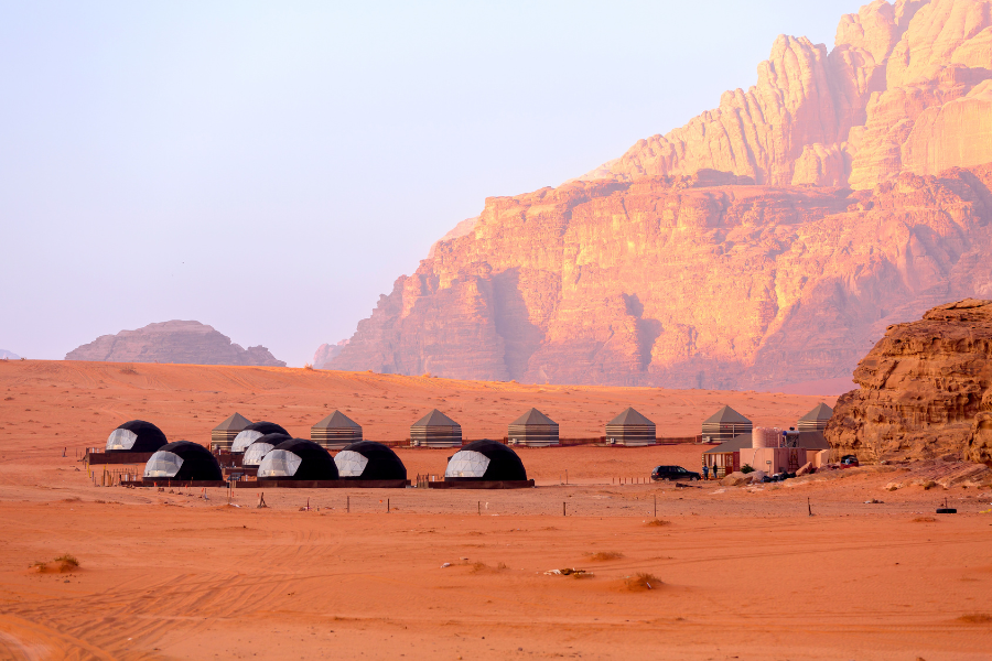 Người ta gọi đó là “lều sao hỏa” không chỉ vì hình dáng tương lai, mà bởi cảm giác khi đặt chân vào Wadi Rum – bạn có cảm tưởng như vừa bước lên một hành tinh khác.