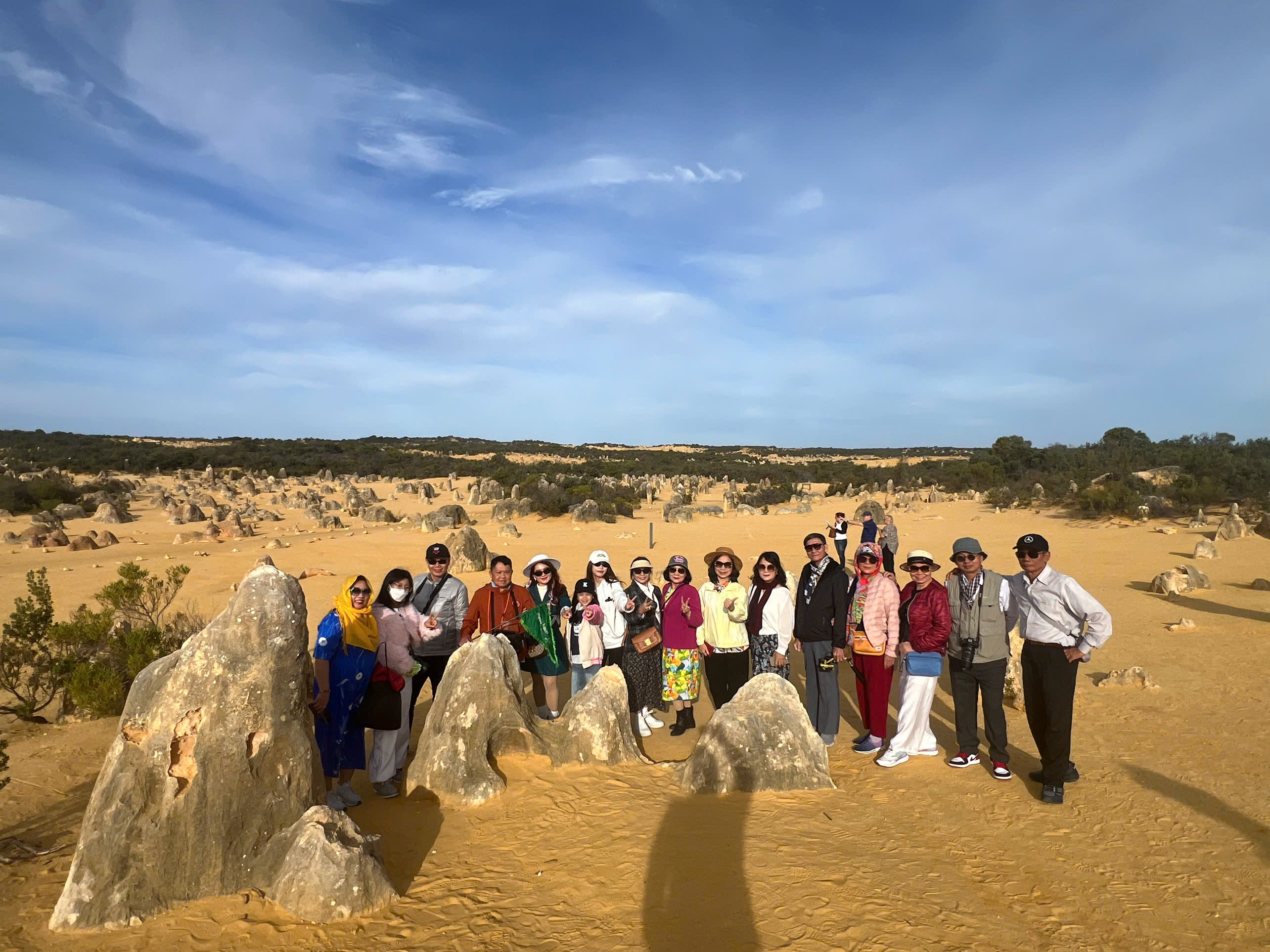 Buổi chiều, đoàn tiếp tục đi tham quan The Pinnacles tại Vườn quốc gia Nambung (click để xem chi tiết). Nằm cách bờ biển phía Tây Nam của Úc không xa, The Pinnacles là sa mạc kỳ lạ với hàng nghìn cột đá vôi bị phong hóa, nhô lên từ những bãi cát vàng.