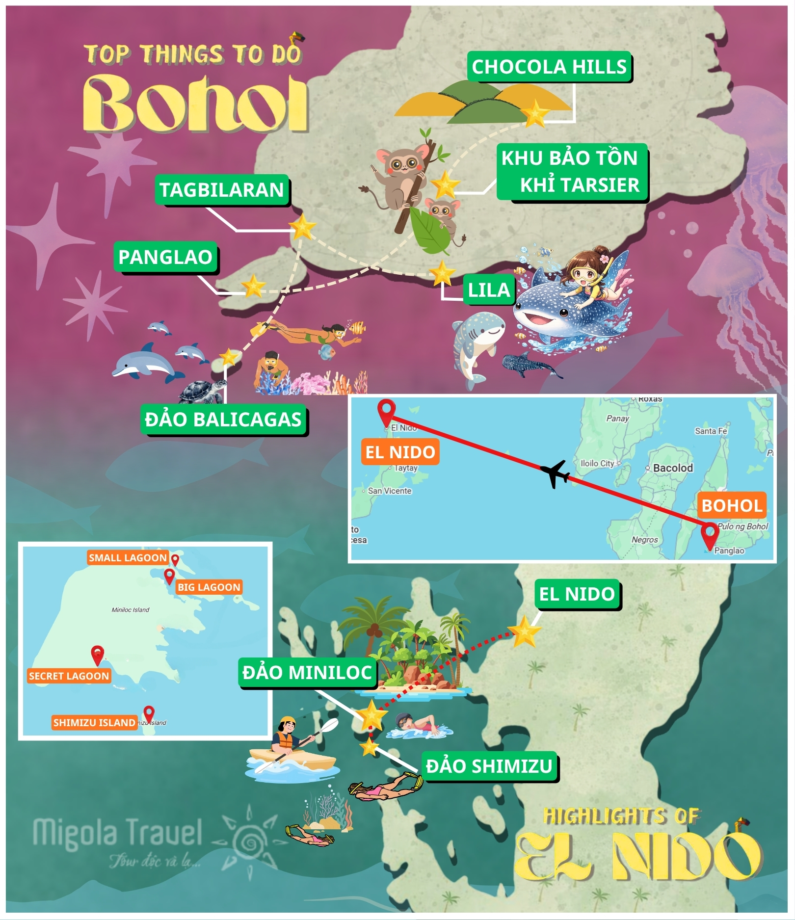 Giữa lòng Thái Bình Dương bao la, nơi những con sóng bạc đầu đã vỗ về dải đất ngàn đảo suốt triệu năm kiến tạo, Philippines hiện lên như một bản hòa ca lộng lẫy của đại dương. Trên dải đất Bohol kỳ diệu, bạn sẽ đứng trước những “viên chocolate khổng lồ” nhấp nhô giữa đại ngàn – một tuyệt tác địa chất được nhào nặn bởi bàn tay tạo hóa, và bắt gặp ánh mắt trong veo của khỉ Tarsier, những linh hồn nhỏ bé canh giữ linh khí cho hòn đảo vĩnh cửu này. Từ những cuộc tương phùng đầy xúc động với “những gã khổng lồ hiền lành” – cá mập voi dưới lòng biển thẳm tại Lila, cho đến khoảnh khắc kỳ ảo khi hàng vạn ánh đom đóm thắp sáng dòng sông Loboc như một dải ngân hà rơi xuống mặt đất.Và khi cánh cửa của El Nido mở ra, bạn sẽ lạc bước vào một thiên đường hoang sơ được Palawan che giấu kỹ càng, nơi những vách đá vôi dựng đứng che chở cho những phá nước xanh trong như pha lê và những dải cát trắng mịn màng như tơ lụa.