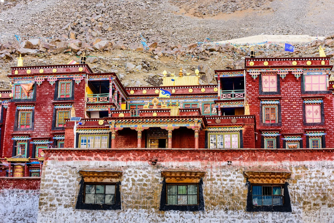 - Kiến trúc: Tu viện được xây dựng theo phong cách truyền thống Tây Tạng, với tường trắng, mái ngói nâu sẫm và những lá cờ nguyện tung bay trong gió.
