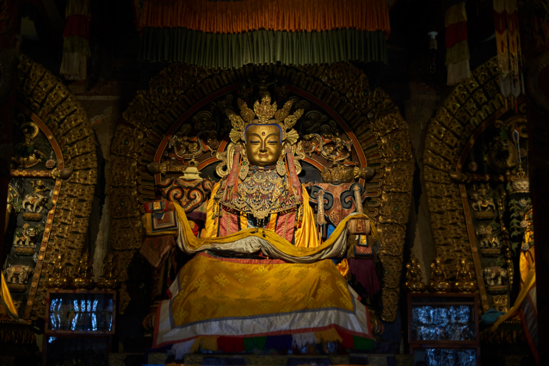 Bên trong, các bức họa thangka rực rỡ kể lại hành trình tu chứng của Đức Phật, các vị Bồ Tát và Hộ Pháp.
